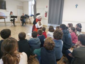 La première séance, axée sur le chant, a permis aux élèves de découvrir différents auteurs et personnages de la période Baroque ainsi qu’un instrument assez utilisé à cette époque: le clavecin. Puis ils se sont essayés aux chants classiques de l’époque avec beaucoup de plaisir!